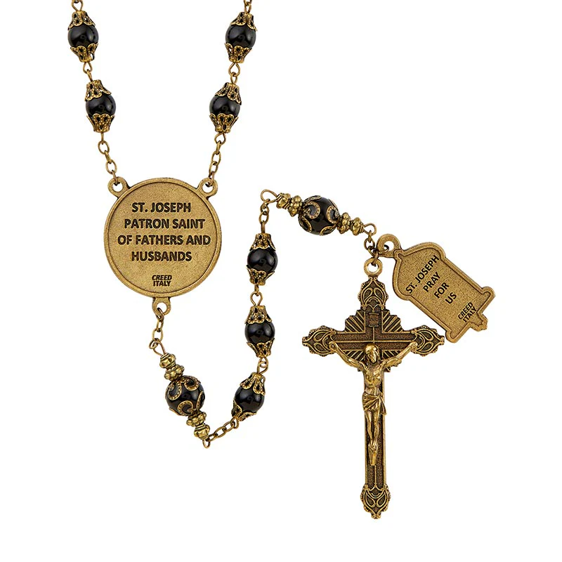 A handsome Collector's Edition Vintage Rosary, featuring smooth, sleek, onyx for the Our Fathers, flanked by elegant filigree caps. The Hail Marys are double-capped onyx in deep black tones, bringing special depth enhanced by the antique gold plated chain and metal work. The centerpiece is a distinctive, round medal depicting St. Joseph holding the Christ Child, and the Crucifix is ornately fashioned with fine detailing.